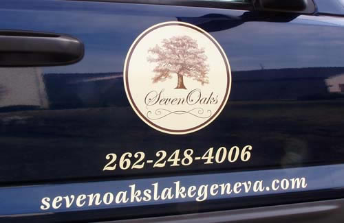 Sign #27 Printed logo and vinyl lettering on an SUV. |