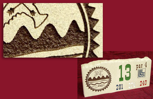 Sign #2 Tee box marker. Sandblasted cut limestone and paint. |